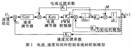 由于系統(tǒng)力矩波動的影響,直流力矩電機的電樞電流會產(chǎn)生波動,在速度環(huán)中加入電流環(huán)增加系統(tǒng)的阻尼以抑制電樞電流的波動。系統(tǒng)電流環(huán)的帶寬應(yīng)為速度環(huán)帶寬的5-10倍,這樣電流內(nèi)環(huán)才能起到快速調(diào)節(jié)電流的作用,改善速度輸出的平穩(wěn)性。電流、速度閉環(huán)控制系統(tǒng)的模型如圖1所示。
